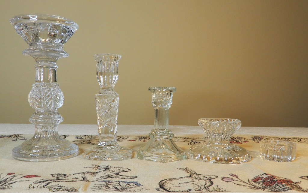 The first step is to find a grouping of glass and crystal candleholders. Antique malls, thrift stores and flea markets are the perfect place to start your journey. With a little patience, you can find exquisite pieces. And the best part? You’ll be able to find them at a price that won’t break the bank. On average you can find them for between $2 and $5.