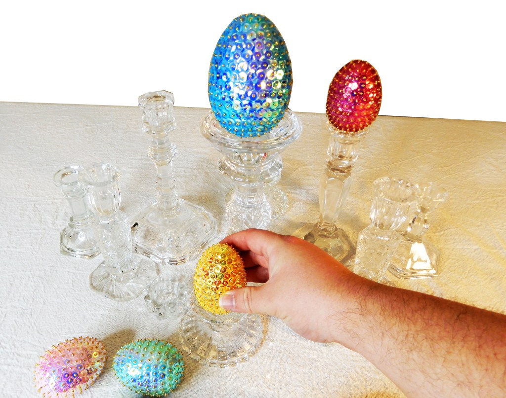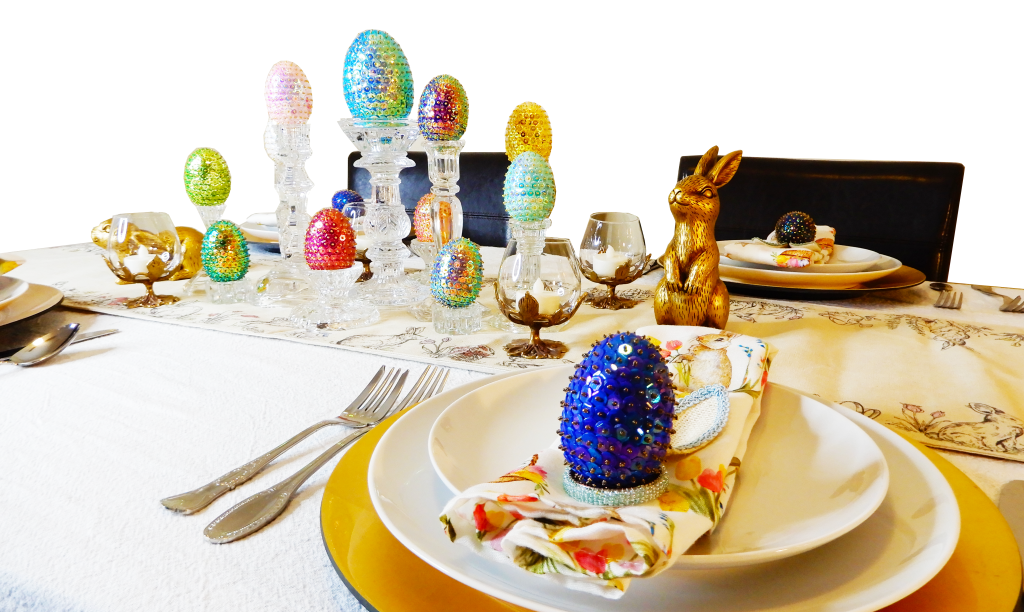 The combination of sequin Easter eggs and crystal candleholders creates a unique and elegant centerpiece that will add a touch of glamour to your table.
