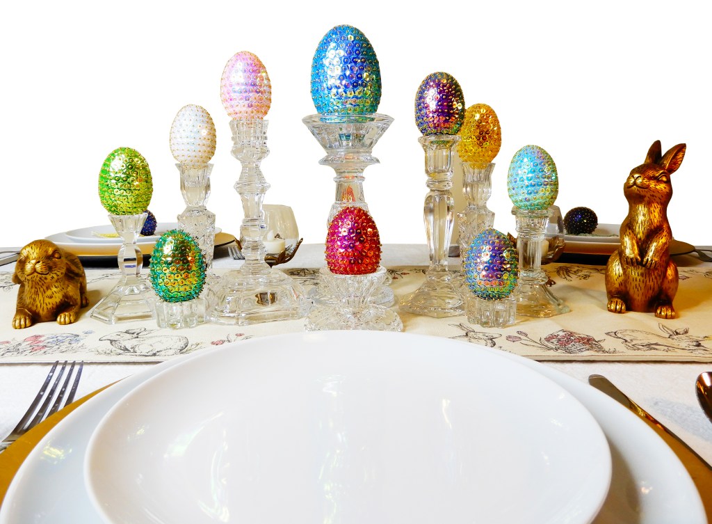 If you’re looking to create a festive Easter tablescape, consider incorporating sequin Easter eggs on crystal or glass candleholders for a stunning and sophisticated look.