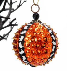 This ornament is a Holidays Lane best seller. The classic color combo of black & orange sequins adds a hint of sparkle to a macabre skull.