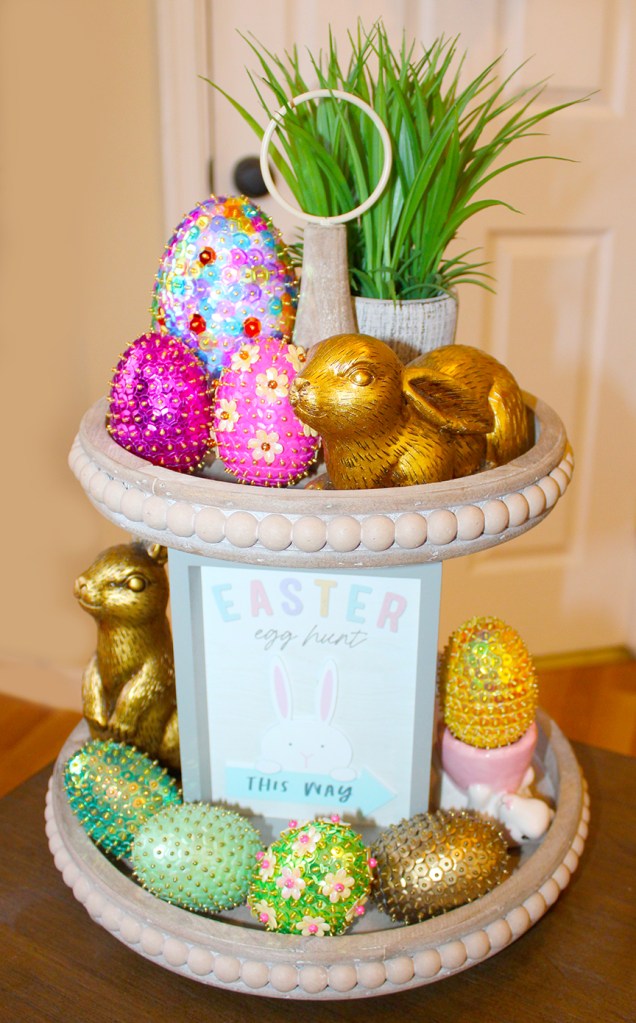 Consider creating a stunning centerpiece using tiered trays adorned with beaded eggs. This eye-catching arrangement adds layers of elegance to your Easter table, providing a focal point that draws attention and sparks conversation.