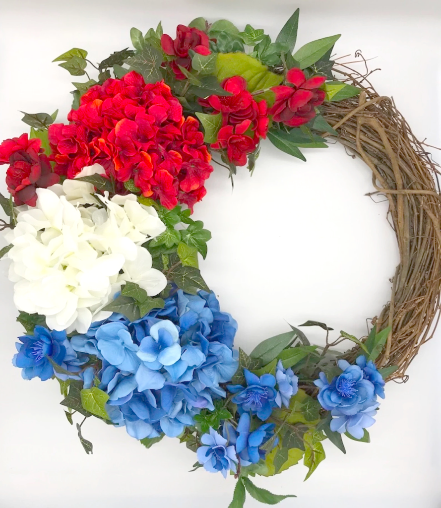 Red, White, and Blue Floral Wreath: Featuring faux flowers in patriotic colors, this wreath brings a touch of elegance to your front door.