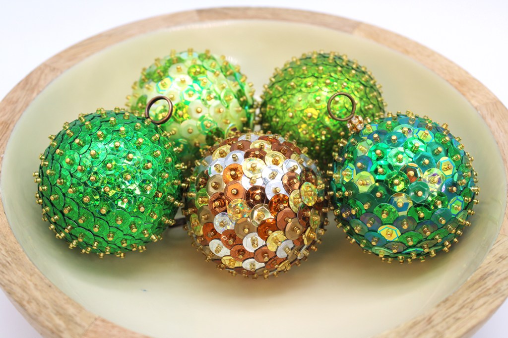 Featuring hand-placed sparkling sequins and gold accents, these ornaments are perfect for trees, garlands, or tiered trays. Whether you’re decorating for a party or simply adding charm to your home, these ornaments will bring the spirit of the holiday to life.
